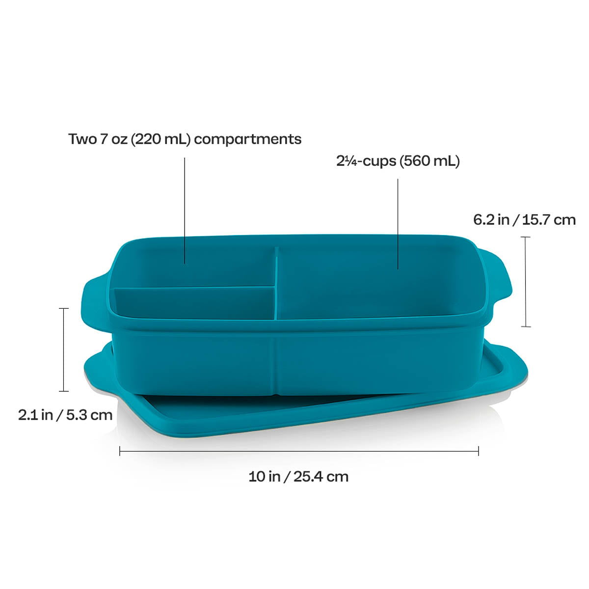 Q: What are the compartment sizes in the Lunch-It® Large Container?A: It features three compartments: one large section holds 2¼ cups (560 mL), and two smaller ones hold 7 oz (220 mL) each – ideal for portioning snacks, sides, and main meals.