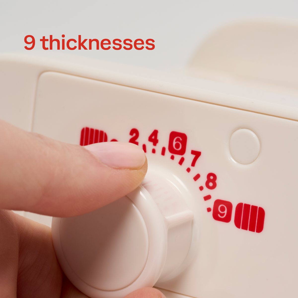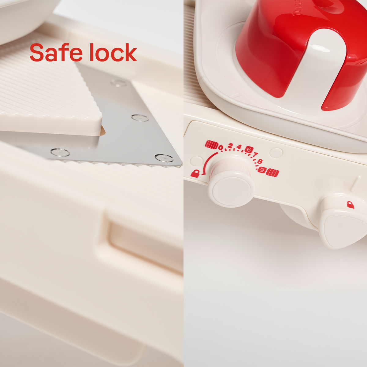 - Multiple settings: one dial for choosing thickness of 1 mm to 9 mm; includes locked position which blocks access to V blade; second dial for choosing julienne width of 6 mm or 9 mm