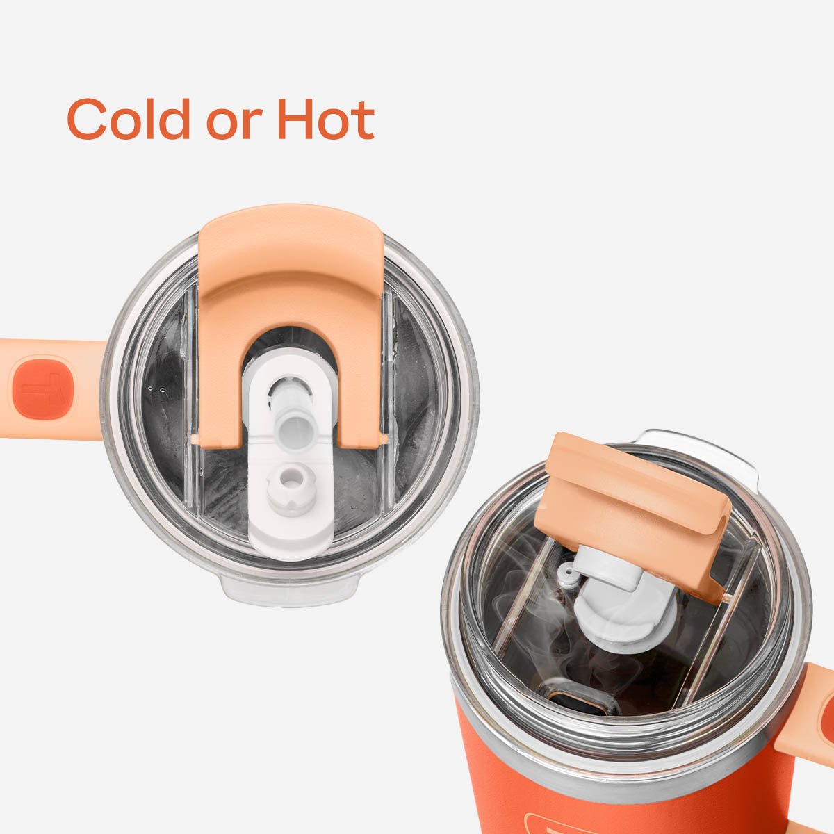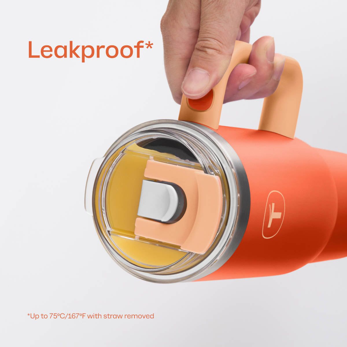 Leakproof*: The flip-top locking lid keeps your beverage where it should be: in your cup.Straw or spout: With both a straw opening and a spout, you can drink any which way you like.Hot or cold drinks: Our double-walled design doubles down on keeping your drink hot (37 oz (1.1L) size – up to 4 hours), cold (37 oz (1.1L) size – up to 17 hours or iced (37 oz (1.1L) size – up to 48 hours)**.Ergonomic handle: Soft and sturdy? The handle on our 37-oz/1.1L big T is solid yet comfortable thanks to its soft-touch material.Protective finish: With a powder coating that prevents scratches, big T will look camera-ready long after you buy.Cup holder compatible: With a smaller base that fits seamlessly in most cup holders, big T is the ultimate car co-pilot.