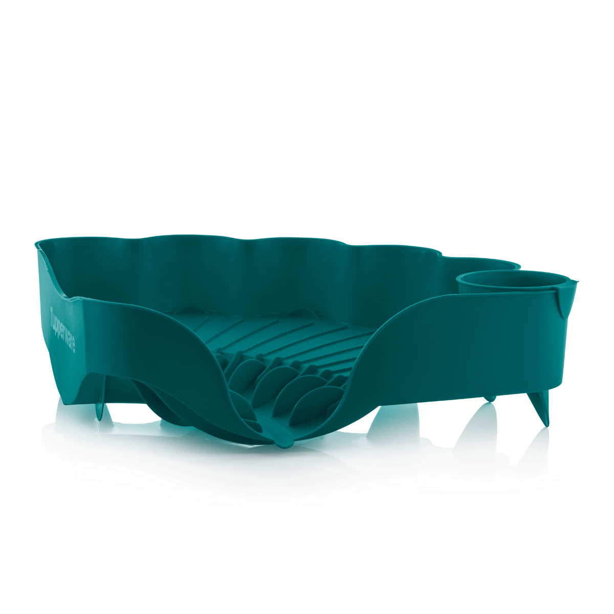 This large dish drainer holds several sizes of dishes and features a lip that allows water to drain directly into the sink for faster drying and no need for a separate tray. Features detachable insert for utensils.